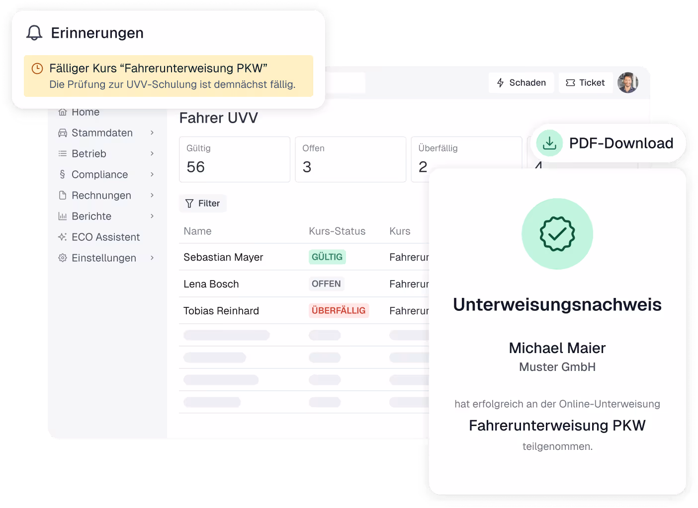 - Fahrerübersicht mit Fälligkeiten & automatischen Erinnerungen
