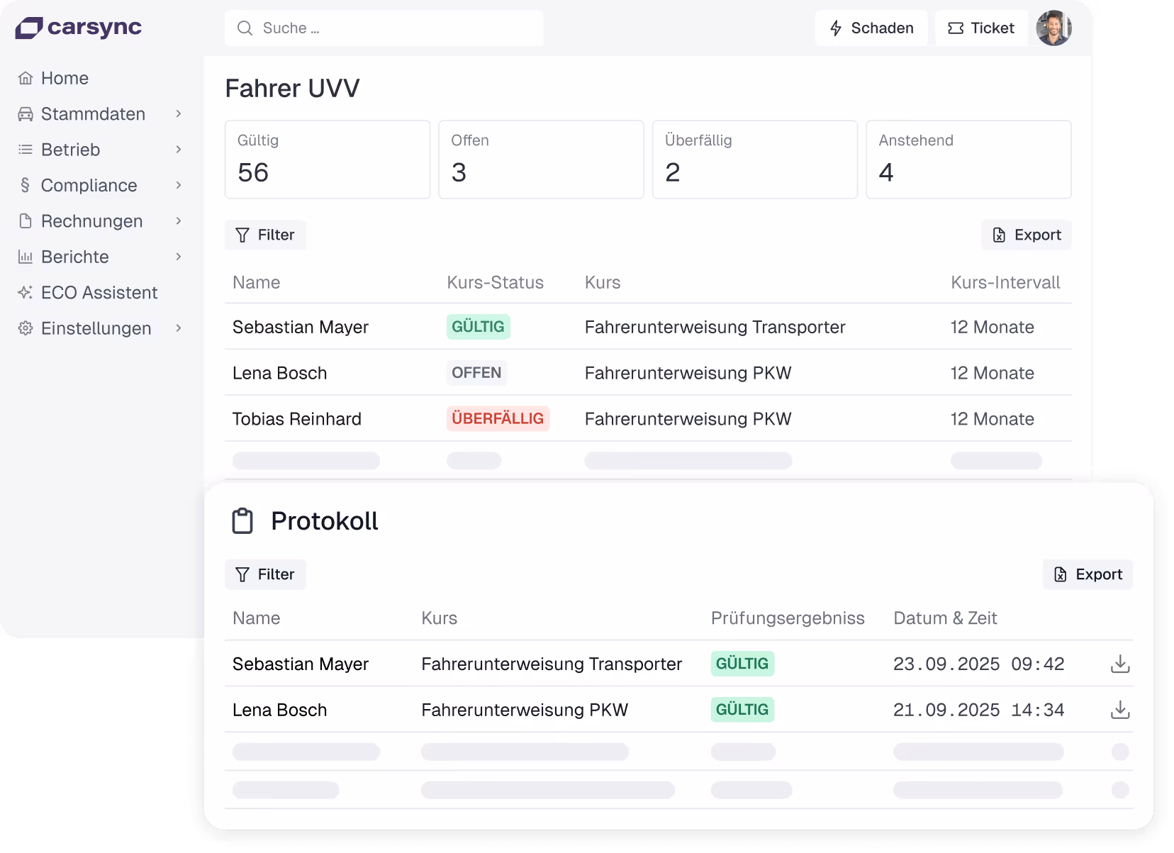 Wenn Fristen übersehen, Unterweisungen vergessen oder Führerscheine zu spät kontrolliert werden, drohen schnell Bußgelder und Haftungsrisiken. Mit CARSYNC laufen Führerscheinkontrollen und DGUV70/UVV-Unterweisungen automatisiert, strukturiert und sicher – für klare Prozesse, weniger Stress und volle Rechtssicherheit.