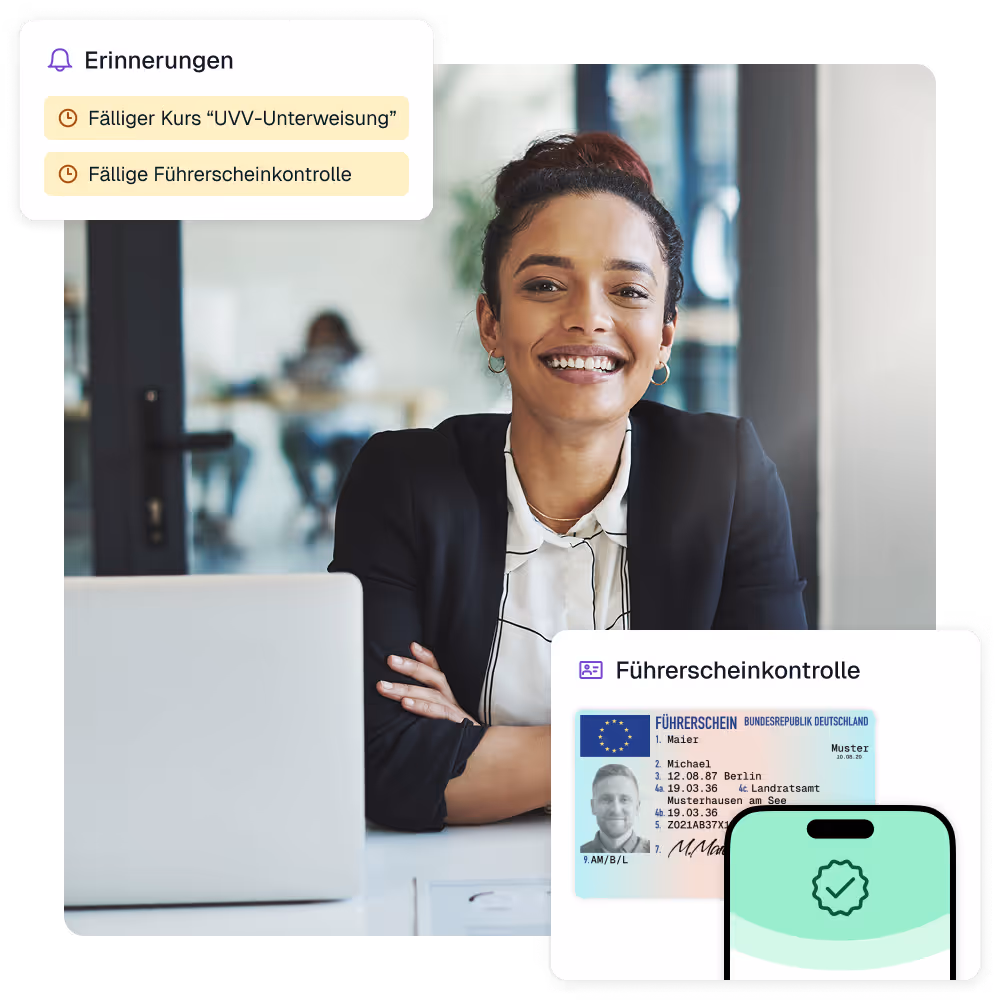 Schluss mit manuellem Nachhalten: Führerscheinkontrollen und DGUV70/UVV-Unterweisungen laufen automatisiert und Nachweise sind jederzeit abrufbar – für mehr Überblick, weniger Stress und klare Prozesse im Alltag.