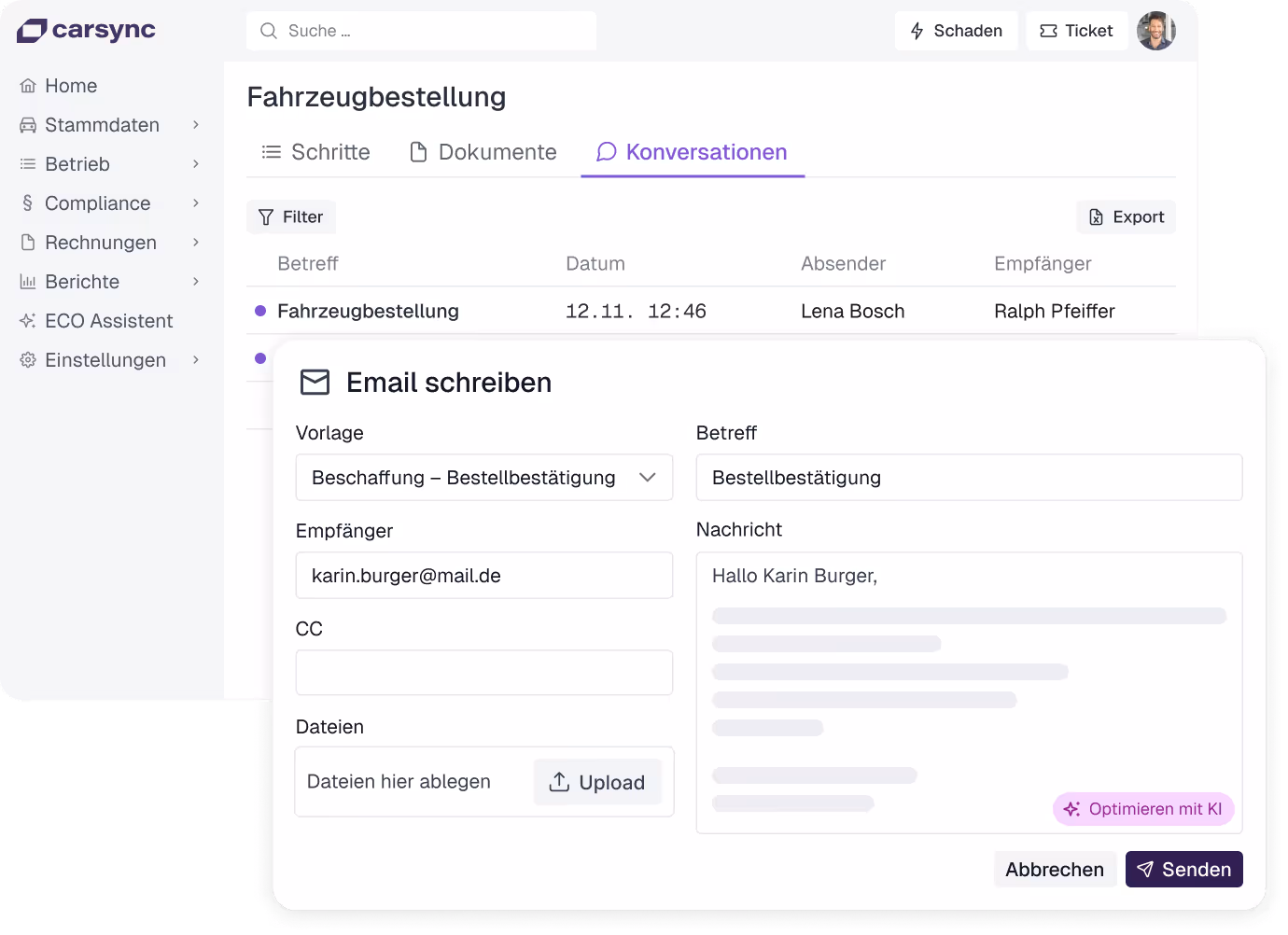 Wenn Bestellungen verzögert, Rückgaben schlecht geplant oder Dokumente verstreut sind, kostet das Zeit, Geld und Nerven. Mit CARSYNC laufen Fahrzeugbeschaffung und -aussteuerung digital, automatisiert und transparent – für klare Abläufe, weniger Abstimmungen und volle Kontrolle über den gesamten Prozess.