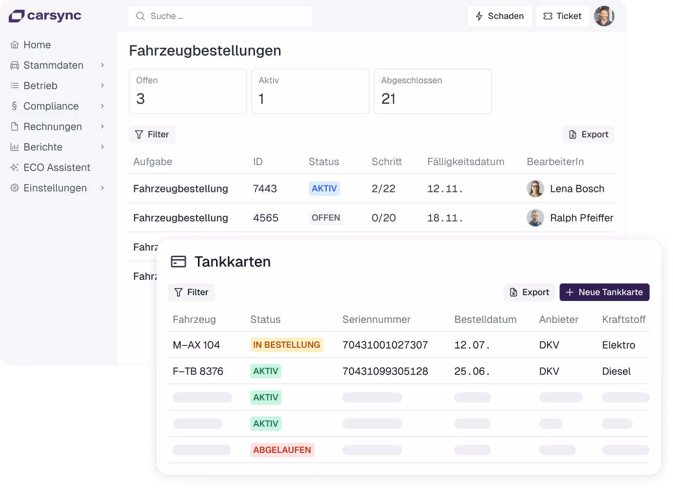 Fahrzeugbestellungen, Spezialumbauten und Tankkarten werden einheitlich gesteuert und digital dokumentiert – für reibungslose Abläufe ohne Medienbrüche.