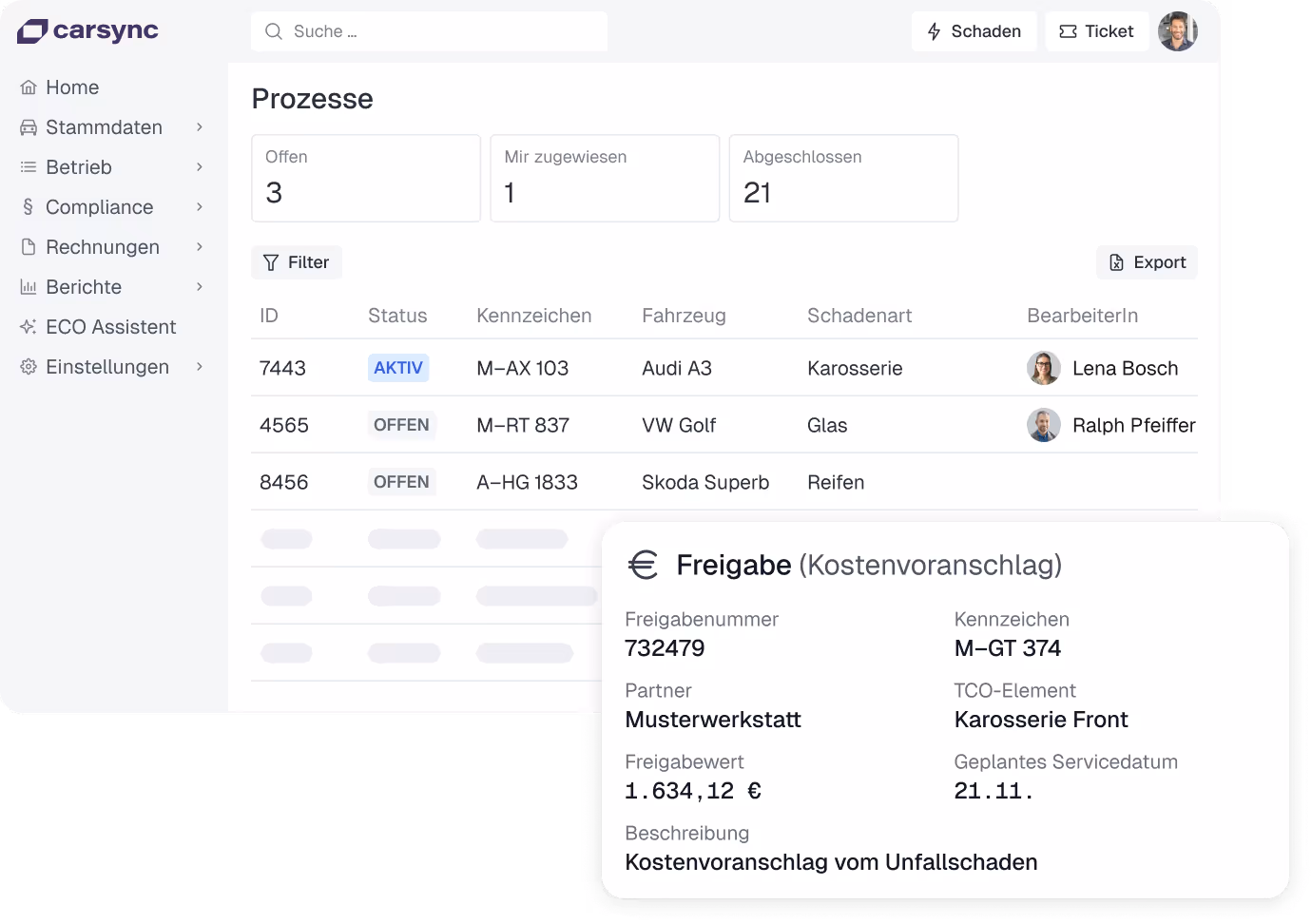 Alle Abstimmungen mit Werkstätten erfolgen über eine Plattform. Freigaben, Terminvereinbarungen und Reparaturstatus sind jederzeit nachvollziehbar – für reibungslose Abläufe ohne Telefon- oder E-Mail-Marathon.